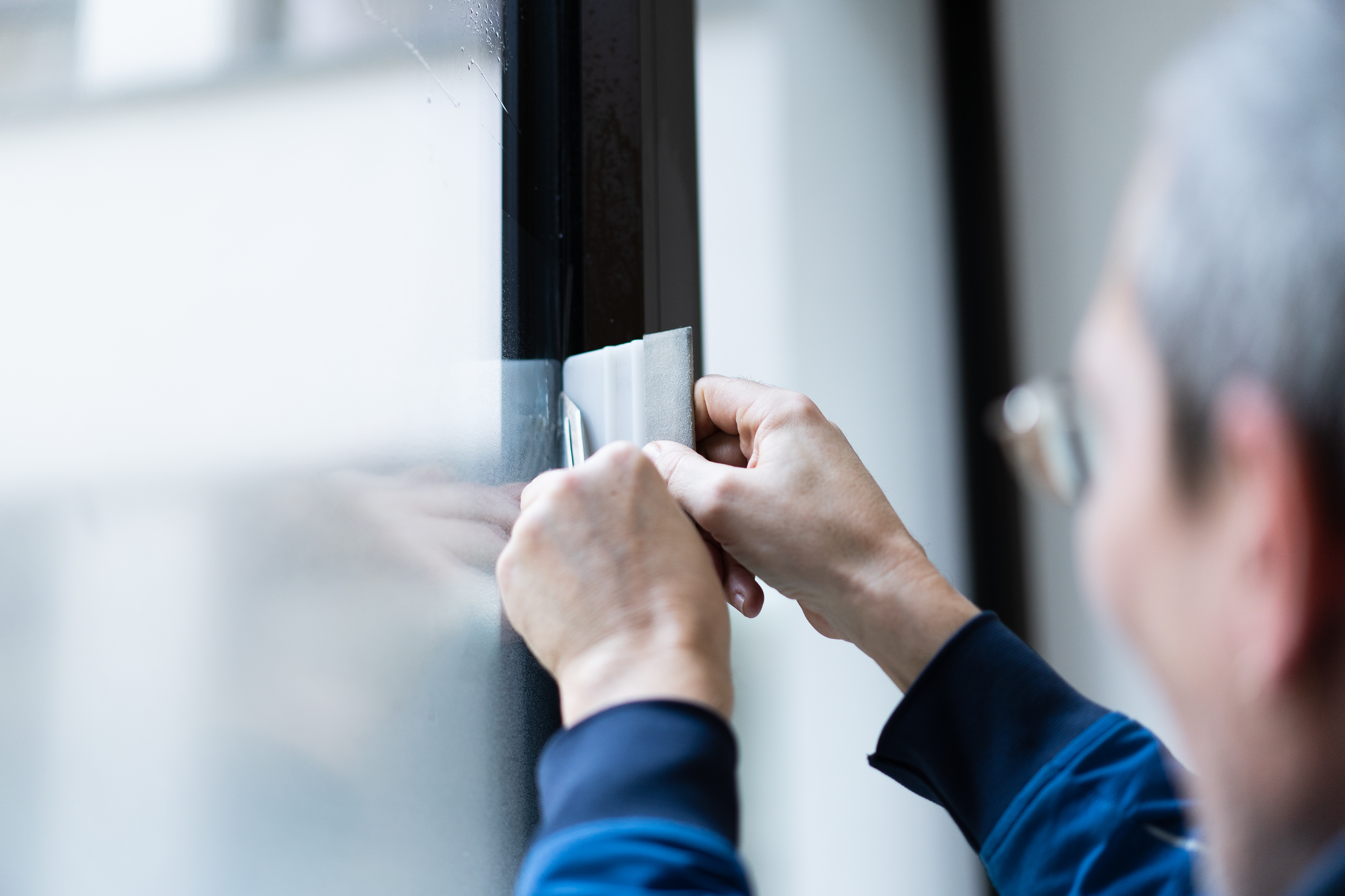 Vor der Montage reinigen wir die Glasoberflächen gründlich, um sicherzustellen, dass die Folie optimal haftet und keine Blasen oder Unregelmäßigkeiten entstehen.