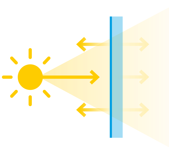 Der Sonnenschutz funktioniert folgendermaßen: Die drei Strahlenbündel des Sonnenlichts werden direkt am Fenster gefiltert und reflektiert, sodass nur noch ein Teil der Sonnenstrahlung überhaupt ins Innere gelangt. Das bedeutet für die einzelnen Strahlenbündel: